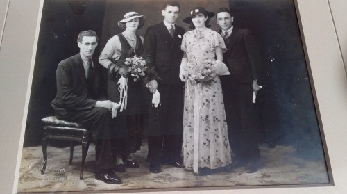 Having unpacked everything else and feeling particularly strong one day, I tackled the family photos. Only two had glass that needed replacing — the large oval one of my grandmother, my mother’s mother, Claire (Donovan) Doyle, and the small A4-sized one of the wedding of Uncle Frank my mother’s younger brother (there were 12 children in that big Irish family) to a lady called Daphne.
